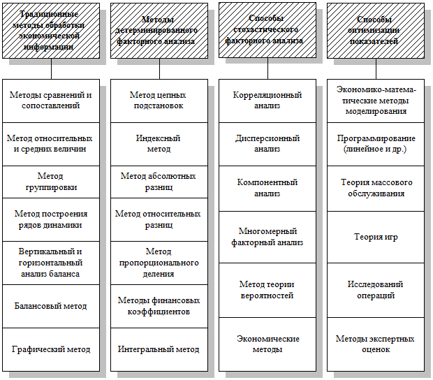 Наибольшее применение в экономическом анализе находят методы, помещенные в первом столбце. В ходе их применения осуществляются: первичная обработка собранной бухгалтерской информации (проверка, группировка, систематизация); изучение состояния и закономерностей развития ресурсного потенциала предприятия; определение влияния факторов на результаты деятельности предприятий; подсчет неиспользованных и перспективных резервов увеличения эффективности производства и реализации; обоснование новых управленческих решений.