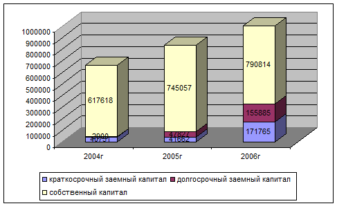По данным таблицы за анализируемый период 2004-2005 гг., в структуре капитала удельный вес по размеру занимает собственный капитал, хотя к концу 2006 года его доля снизилась и составила 70,71%. Возрасла доля заемного капитала в 2006 году она составляла 6,6% от общей величины капитала, а к концу 2007 года она составила 29,29%. Рассмотренная структура заемного капитала в 2006 году на долю долгосрочного капитала 13,94% от общей суммы, и 15,36% относится к краткосрочным.