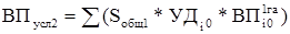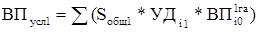где ВП - выход продукции; ВПусл1, ВПусл2 - общий выход продукции при фактической и базовой площади соответственно; Sобщ - общая посевная площадь, УДi0, УДi1 - удельный вес площади, занятой i-ой культурой в базовом и отчетном периоде.
