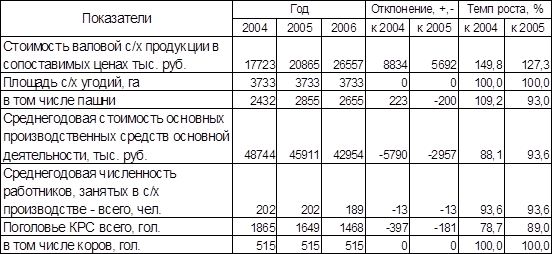 Основной показатель (стоимость валовой сельскохозяйственной продукции) в отчетном 2006 году по сравнению с базисным 2004 годом увеличился на 49,8 процентов. Площадь сельскохозяйственных угодий в 2006 году осталась без изменений и составила 3733 гектара, из них 2655 гектар или 71,1 процента занято пашней, что характеризует хорошую освоенность сельскохозяйственных угодий. В отчетном году уменьшилась площадь пашни по сравнению с 2005 годом на 200 гектар, так как за счет этих земель была увеличена площадь пастбищ. Существенно снизилась среднегодовая стоимость основных производственных средств основной деятельности в 2006 году по сравнению с базисным 2004 годом на 11,9 процентов. Снижение данного показателя повлекло значительное выбытие продуктивного скота, машин и оборудования. Хотя поголовье коров в стаде в отчетном году осталось без изменений и составило 515 голов, однако общее поголовье КРС существенно снизилось в 2006 году по сравнению с базисным 2004 годом на 21,3 процента, так как увеличилась реализация скота в живой массе и забой на мясо. По численности работников видно, что этот показатель в 2006 году ниже показателя 2004-2005 годов на 13 человек из-за сокращения численности штата. Исходя из представленных данных видно, что хозяйство не является крупным, однако оно развивается достаточно стабильно и является устойчивым.