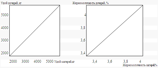 Сравнение быков–производителей методом "дочери-матери" заключается в том, что продуктивность дочерей быков сравнивается с продуктивностью своих матерей. Для этого используется решётка наследственности. Для этого чертят квадрат, делают отметки велечины продуктивных показателей дочерей и матерей (как показано выше), из пересечения двух осей проводят диагональ, далее на пересечении линий, проведённых от показателей каждой пары мать-дочь, ставят точку. Если большинство отметок окажутся над диагональю, то бык улучшатель, если под ней – ухудшатель, если точки расположены равномерно, то нейтральный.