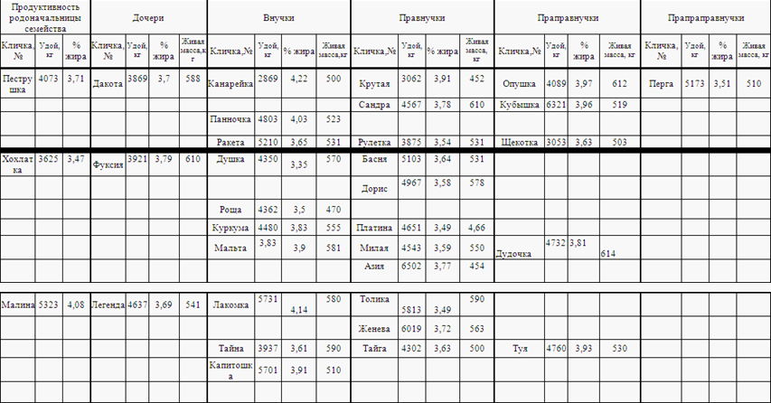 Работа с семействами основана на давно установленной связи между продуктивными качествами матерей и их дочерей Качества эти могут быть усилены путем использования в подборе производителей-улучшателей из ведущих линий данной породы. Целью работы с семействами и является развитие в потомстве коров-родоначальниц их ценных качеств путем использования в каждом поколении лучших линейных производителей. [4,5]