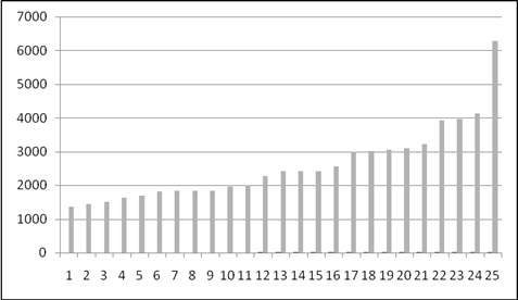 Проанализируем данные ранжированного ряда и его графика - оценим характер и интенсивность различий между хозяйствами и попытаемся выделить существенно отличные группы хозяйств. Между хозяйствами имеются существенные различия в уровне молочной продуктивности коров: размах колебаний составляет 6270 - 1364 = 4906 кг от 1 коровы, а уровень производства молока в хозяйстве №25 выше, чем в №1 в 4,6 раза (6720/1364).
