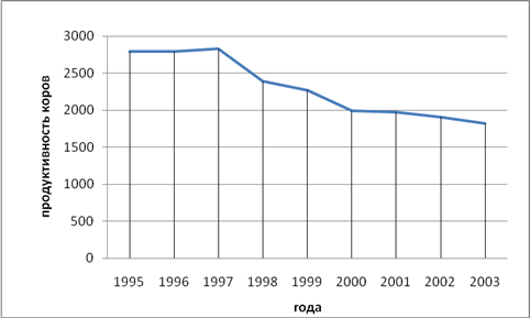 Проанализируем полученные показатели. Происходит абсолютное уменьшение размера уровня продуктивности в СЗАО «Анашенское», самое наибольшие снижение удоя от 1 коровы было в 2000 г. (на 280 кг). Так такового темпа роста и прироста за последний год в этом хозяйстве по сравнению с базисным периодом не происходит, а наоборот, что свидетельствует о том, что происходит снижение темпов производства, т.е. к снижению уровня продуктивности (с 1995 по 2003 уровень продуктивности снизился с 2790 до 1820 кг с 1 коровы в год). Средняя продуктивность составила 2310 кг с одной коровы в год.
