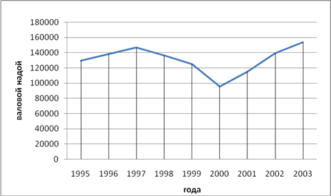 Проанализируем полученные показатели. Абсолютное уменьшение размера валового надоя наблюдалось с 1999 - 2000 гг. по сравнению с базисным периодом, а в остальные годы был прирост (самый большой в2003 г. - 23923 ц по сравнению с базой). С 1998 - 2000 гг. было абсолютное уменьшение валового надоя коров, по сравнению с прошлым периодом. Тоже самое можно сказать и темпе роста и прироста, что с 1999 по 2000 гг. этого явления не наблюдалось по сравнению с базисным периодом и по отношению к прошлому периоду с 1998 по 2000 гг. Абсолютное значение 1% прироста росло до 1998 г., а затем оно стало уменьшатся, достигнув своего минимума в 2001 г. начало расти. Средний валовой надой за 1995 - 2003 гг. составил 131161 кг от поголовья за год.