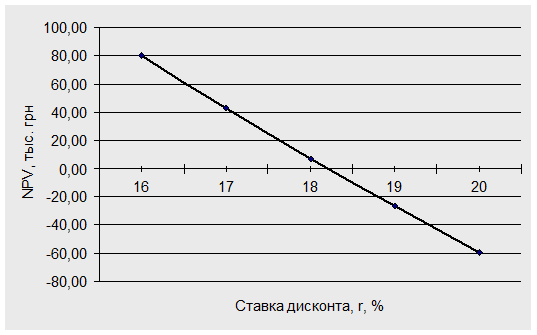 На основании таблице 2.19 построим график зависимости NPV от ставки дисконта для определения внутренней нормы доходности проекта. (рис. 2.5)
