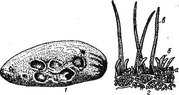 1 — пораженный огурец; 2 — конидиальное ложе возбудителя (а — конидиеносцы; б — конидии, в — щетинки).