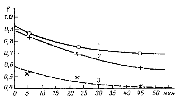 Г.И. Швебс отмечает также что уменьшение впитывания наблюдается не только при установившимся режиме, а проявляется с самого начала опыта. Правда, по мере развития стока, влияние эродированности увеличивается на (рисунке 6) показана динамика величины относительного изменения впитывания ( f = K'0/K0, где K'0 и K0 – интенсивности впитывания на смытой и не смытой почвах) во времени для почв с различной степенью смытости гумусового горизонта.