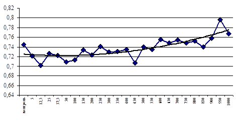 Как видно на рисунке, несмотря на существенный разброс в показателях весового коэффициента в зависимости от концентрации, прослеживается тенденция к увеличению анализируемого показателя. Этот факт является косвенным признаком стимулирующего влияния глифосатсодержащего гербицида «Раундап» на развитие проростков тритикале.