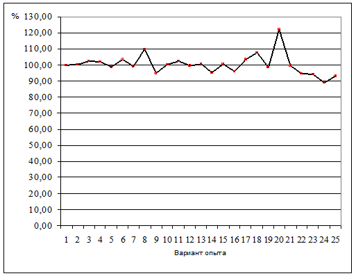 Рисунок 5 – Отношение концентрации хлорофиллов a и b (контроль 100%) 1 – контроль, 2–25 – варианты опытов с различной концентрацией