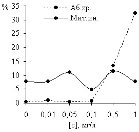 Выявлена цитогенетическая активность трефлана (рисунок 1): частота перестроек в опыте, где концентрация гербицида составляла 1 мг/л, была выше, чем в контроле более чем в 68 раз (32,37 и 0,47% соответственно).