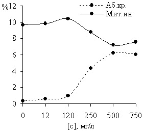 Рисунок 1 – Влияние гербицидного препарата трефлан на частоту хромосомных аберраций и величину митотического индекса у Hordeum vulgare L. сорт «Визит»