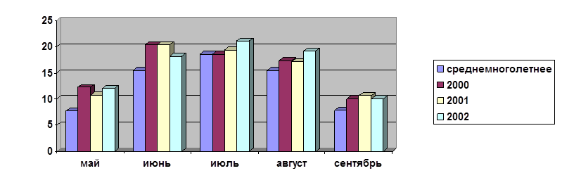 2002 год в мае количество осадков превысило среднемноголетнюю норму. В остальных месяцах количество осадков не превышало среднемноголетнюю норму. Отсюда следует, 2000 и 2002 года были засушливыми по сравнению с 2001 годом.