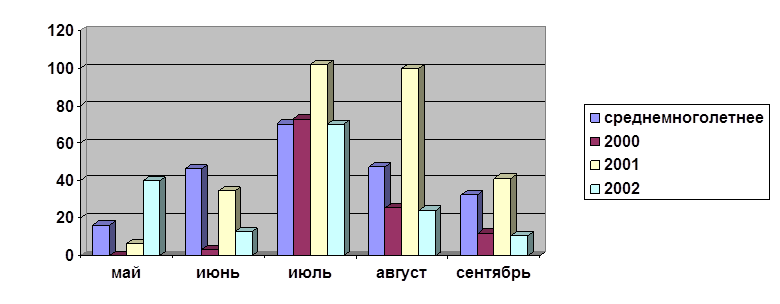 Из диаграммы видно, что в мае 2000 года количество осадков было очень низкое, в июне этого же года повысилось на 3,0 мм. В июле 2000 года резко возросло на 70 мм, а в августе и сентябре наблюдалось опять понижение.