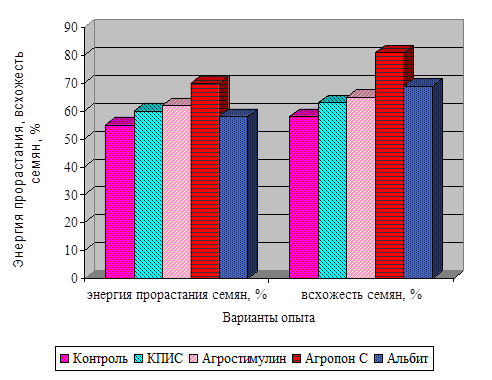 Наиболее существенно увеличилась энергия прорастания и всхожесть семян при обработке семян регулятором роста растений Агропоном С: энергия прорастания на - 15 %, всхожесть на – 23 % в сравнении с контрольным вариантом. При обработке другими регуляторами роста и КПИС не удалось добиться существенного увеличения этого показателя. При обработке семян Альбитом энергия прорастания увеличилась по сравнению с контролем на – 3 %, всхожесть на - 11 %. При обработке семян Агростимулином энергия прорастания и всхожесть увеличились по сравнению с контролем на – 7 %, всхожесть на -7 %.
