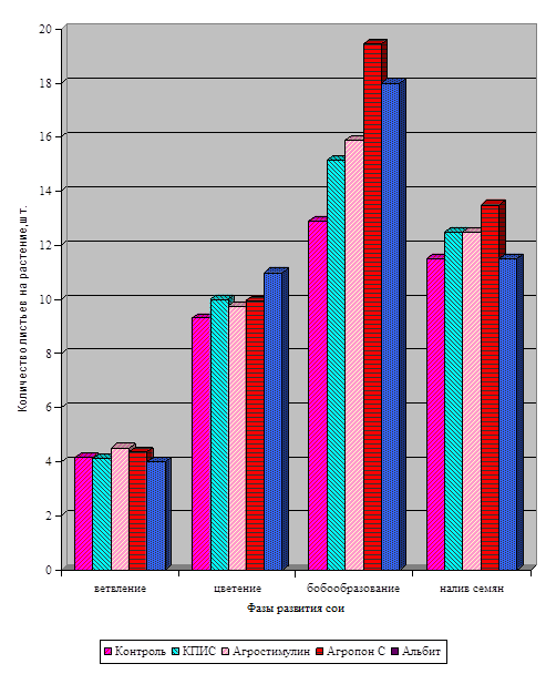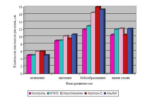 Следовательно, чем больше количество листьев, тем большее количество ассимилятов, в результате фотосинтеза в них образуется и поступает в семена. В начале вегетационного периода количество листьев на растение сои интенсивно нарастает. Перед началом генеративного периода вегетативный рост растений сои замедляется, а во время образования бобов во всех узлах прекращается (Беликов, 1962; Беликов, 1978).