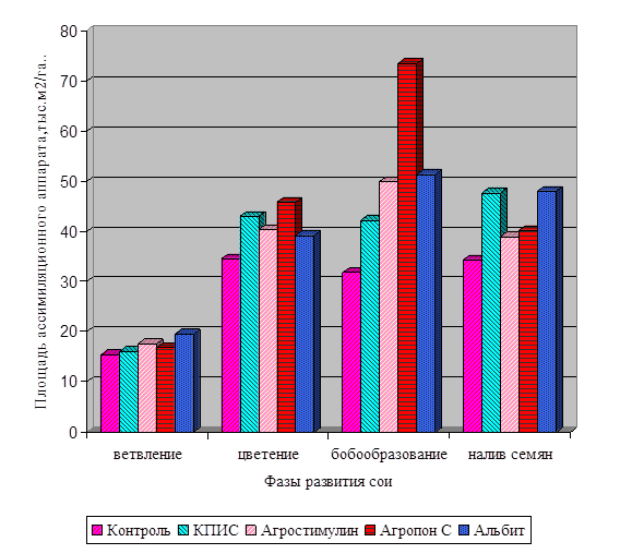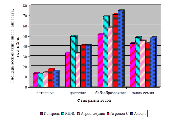 В 2005 г. в фазу цветения наблюдалась наиболее существенная разница во влиянии регуляторов роста растений на показатель площади листьев. Так, под влиянием обработок регуляторами роста растений и КПИС площадь листьев увеличилась от 4,4 % - 31,6 % по сравнению с контролем. Наиболее примечателен тот факт, что под влиянием обработки семян регулятором роста растений Агропоном С площадь листьев была на более высоком уровне, в течение всей вегетации, вплоть до налива бобов. По всей видимости, это способствовало более длительному оттоку ассимилятов в семена, что в конечном итоге привело к увеличению общей урожайности сои.