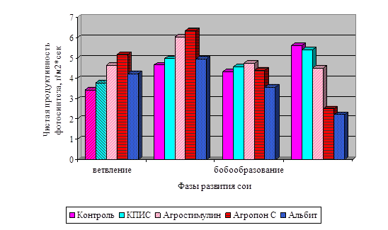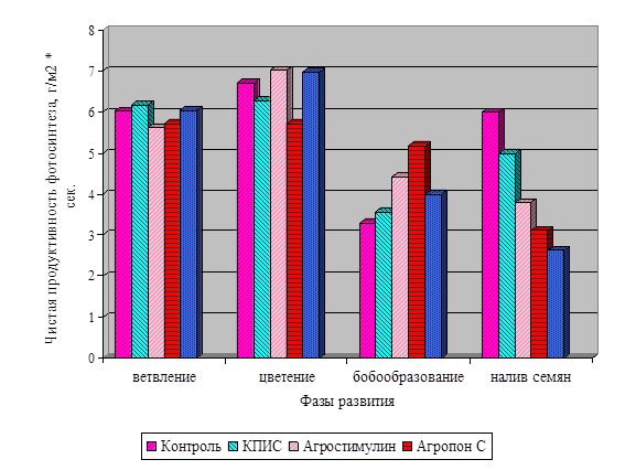 В фазу налива семян в 2005 г. наиболее ярко выражено снижение показателя чистой продуктивности фотосинтеза (ЧПФ), максимальным в эту фазу он был в контрольном варианте, а минимальным в варианте, где семена обрабатывали Альбитом, и разница составила 129 %. В 2006 г. наименьший показатель чистой продуктивности фотосинтеза в вариантах, где семена обрабатывали Агропоном С, и Альбитом, наибольший в контрольном варианте, разница составила соответственно 55,4 % и 60,7 %.