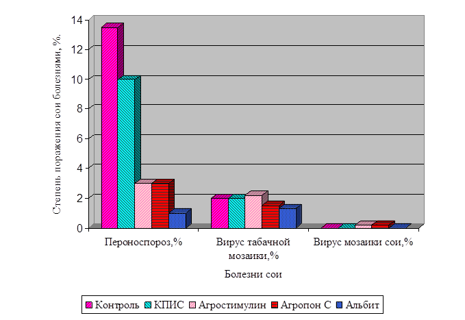 В фазу бобообразования пероноспорозом в большей степени были повреждены контрольный вариант и вариант, где семена обрабатывали КПИС, степень поражения составила соответственно 13,5 % и 10 % соответственно.