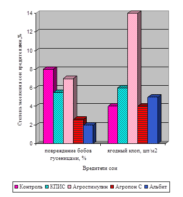 Бобы повреждаются в разной степени многими вредителями, и особенно опасно повреждение их в фазу бобообразования, так как они доступны для питания, створки мягкие для внедрения. В большой степени бобы повреждаются в эту фазу гусеницами разных видов. В вариантах опыта, где семена обрабатывали Агростимулином, бобы были повреждены на 7 %. Контрольный вариант был поврежден на 8 %. Варианты опыта, где семена обрабатывали Агропоном С и Альбитом были повреждены в среднем на 2 %.