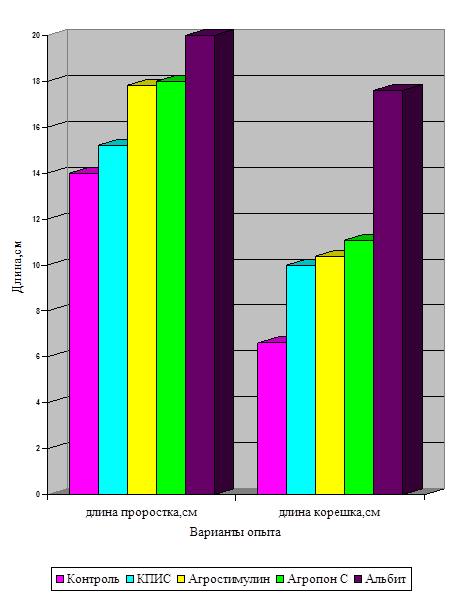 Рисунок - Влияние регуляторов роста растений на длину корешка и проростка, сои сорта Вилана, КубГАУ, 2006г.