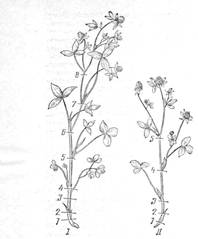 Рисунок 1. Схема строения клевера лугового: I – одноукосного; II – двуукосного; 1-8 – междоузлия