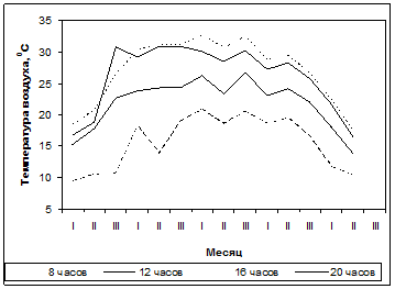 В 8 ч утра растения испытывали сильный недостаток в тепле, что вело к отставанию растений в росте, развитии, снижало завязывание цветков и образование плодов. В летние месяцы в дневной период (12 ч. и 16 ч. дня) растения угнетались высокими положительными температурами, которые также отрицательно влияли на растения томата.