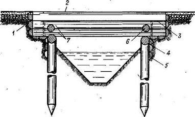 3) пол и стены шлюза (из пластин или досок), прикрепленные к сваям. Выше и ниже шлюза на 3—7 м канал укрепляется.