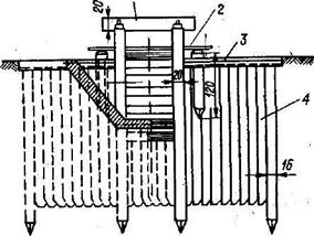 1 - шапочный брус; 2 — служебный мостик; 3 — насадка; 4 ~ передняя стенка шпунта