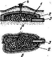 а - разрез; б — план; 1 — каменная наброска; 2 - глиняный изолирующий слой; 3 — водоразборная труба; 4 — вытяжная труба