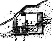 1 - смотровая камера; 2 —шток для регулирования спуска воды; 3 — приемный клапан; 4 — переливная труба; 5 —грязевая труба; 6 — всасывающая труба; 7 —лаз ,