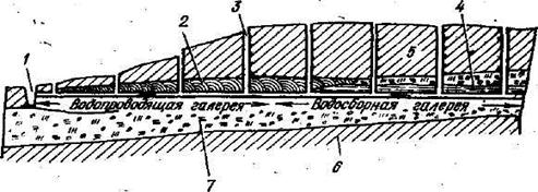 1- канал; 2 - глина; 3 — вспомогательный колодец; 4— уровень грунтовых вод; 5 — песок; 6 — водоупорный слой; 7 — галечный водоносный слой