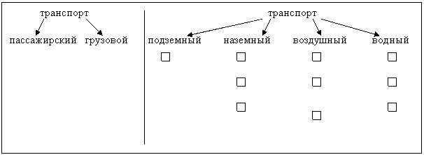 Учитель вывешивает на доску карточку со словом «транспорт». Учитель вывешивает на доску карточку со словом «пассажирский». Учитель вывешивает на доску карточку «грузовой». Учитель вешает на доску карточку «наземный». Учитель вывешивает на доску карточку «водный». Учитель вывешивает на доску карточку со словом «воздушный». На доске вывешивается соответствующая карточка. |