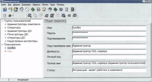 В строке состояния отображается информация по текущему авторизованному в системе пользователю и базе данных. Также при выборе некоторых пунктов меню в строке состояния может отображаться поясняющая для данного пункта информация.