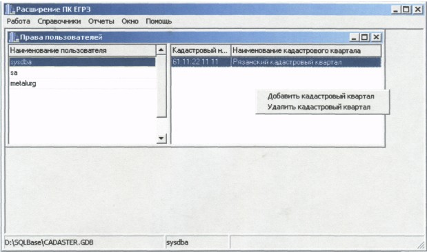 Раздавать права в модуле ЕГРЗехt может только пользователь sisdba. Для раздельной работы с информацией каждому пользователю задаются кадастровые кварталы, с которыми он может работать. Для данных кадастровых кварталов пользователю доступны все операции (добавление и удаление контуров, получение отчетной информации и т.д.).