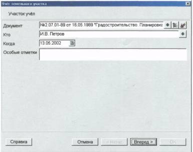 При учете земельного участка, имеющего статус «Справочный», в поле КН участка автоматически заносится очередной кадастровый номер земельного участка в данном кадастровом квартале, а в поле Предыдущий номер ранее учтенного участка -- старое содержимое поля КН участка.
