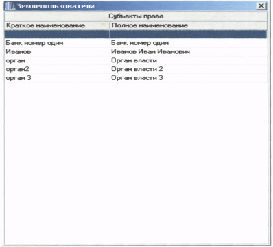 Отчет «Поконтурная ведомость» выводит информацию по контурам участков землепользователя. Перед построением отчета, на экран выводится диалог, в котором необходимо выбрать землепользователя, по которому будет выведена информация. Выбор производится из выпадающего по правой кнопке мыши меню или по нажатию кнопки «Еnter»