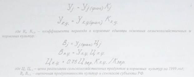 Продукция кормовых культур в стоимостном выражении оценивается по цене одного центнера кормовых единиц фуражного зерна. Цена фуражного зерна принимается на уровне 75 % от средней реализационной цены всего объема товарного зерна по России