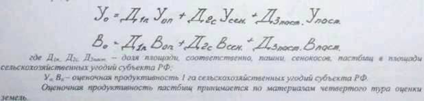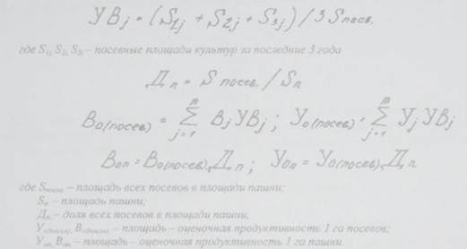 Рассчитывается средняя оценочная продуктивность 1 га посевов путем взвешивания оценочной продуктивности культур на структуру посевных площадей по субъекту РФ, сложившуюся в средней за последние 3 года. Оценочная продуктивность 1 га пашни определяется умножением средней оценочной продуктивности 1 га посевов на долю всех посевов и площади пашни.