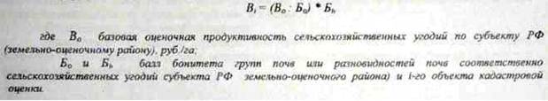 Валовая продукция объекта государственной кадастровой оценки (В1) определяется путем дифференциации базовой оценочной продуктивности сельскохозяйственных угодий по субъекту РФ (земельно-оценочному району) пропорционально баллам бонитета почв объекта кадастровой оценки по формуле: