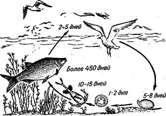 В кишечнике рыбы промежуточный хозяин (рачок) под влиянием пищеварительных ферментов переваривается, а процеркоид проникает в стенку кишечника и током крови заносится в брюшные мышцы, а затем попадает непосредственно в брюшную полость. Здесь паразит превращается в третью стадию личинки, которая называется плероцеркоид. Инвазионной стадии плероцеркоид достигает через 12—14 месяцев. В организме рыбы лигула в стадии плероцеркоида может жить 2—3 года. Одновременно с увеличением размера плероцеркоида в стробиле закладываются половые органы, но окон-чательно они не развиваются, так как для этого в организме рыб нет соответствующих условий [11].
