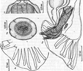 Рисунок 1. Dictyocaulus filarial: 1 – головной конец латерально; 2 – головной конец апикально; 3 – хвостовой конец самца латерально; 4 – часть бурсы самца