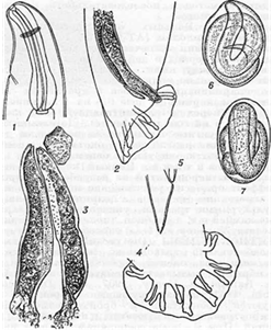 Рисунок 2. Dictyocaulus arnfieldi: 1 – головной конец латерально; 2 - хвостовой конец самца латерально; 3 – спикула и рулек; 4 – схема бурсы самца; 5 – хвостовой конец самки; 6-7 – яйца