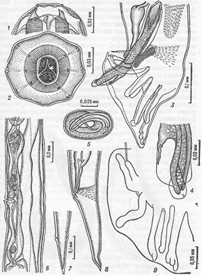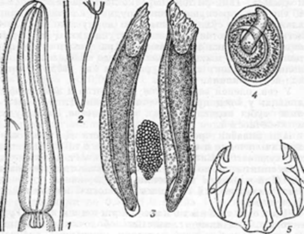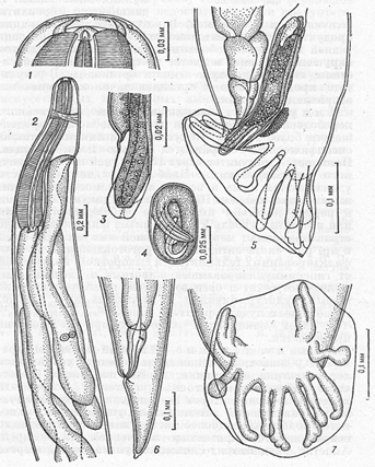 2 – передний конец; 3 – дистальный конец спикулы; 4 – яйцо;