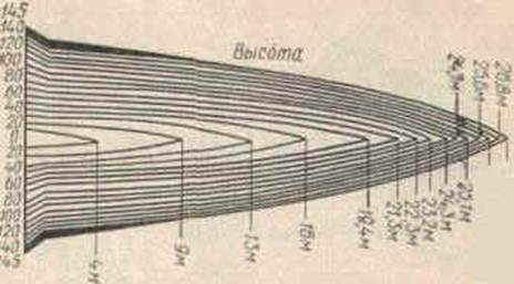 На поперечном разрезе ствола можно видеть концентрические слои, расположенные вокруг сердцевины. Эти образования называются годичными слоями и в большинстве случаев представляют собой ежегодный прирост древесины. Годичные слои хорошо заметны у всех пород, но особенно хорошо у хвойных. На радиальном разрезе годичные слои имеют вид продольных полос, на тангенциальном — извилистых линий (Рис. 1). Годичные слои нарастают ежегодно от центра к периферии.Строение ствола схематически можно представить следующим образом: годичные слои накладываются один на другой, как сплошные конусы, имеющие общий стержень — сердцевину. Из приведенного рисунка видно, что число слоев по высоте ствола уменьшается. Это объясняется ростом дерева не только в толщину, но и в высоту. По числу годичных слоев можно определить возраст той части ствола, где прошел разрез. Ширина годичных слоев зависит от породы, условий произрастания, положения в стволе. У одних пород (быстрорастущих) годичные слои широкие, до 1—1,5 см (тополь, ива), удру-гихузкие, до 1 мм (самшит, тис). В нижней части ствола годичные слои более узкие, вверх по стволу ширина слоев увеличивается. У одной и той же породы ширина годичных слоев может быть различной. При неблагоприятных условиях роста (засуха, морозы, недостаток питательных веществ, заболоченные почвы) образуются узкие годичные слои. В отдельные годы образования годичных слоев может не происходить из-за недостатка питания, чрезмерной обрезки ветвей и пр. Иногда на двух противоположных сторонах ствола годичные слои имеют неодинаковую ширину. Например, у деревьев, растущих на опушке леса, на стороне, обращенной к свету, годичные слои имеют большую ширину, вследствие чего сердцевина смещена и ствол имеет эксцентричное строение. Некоторым породам свойственна неправильная форма годичных слоев. Так, у граба, можжевельника на поперечном разрезе наблюдается волнистость годичных слоев.
