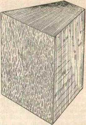 Сердцевинные повторения. На поперечном разрезе некоторых пород (бук, дуб) хорошо видны светлые, часто блестящие, направленные от сердцевины к коре по радиусам линии, называемые сердцевинными лучами (Рис. 3.). Сердцевинные лучи имеются у всех пород, но только лишь у некоторых они широкие и поэтому видны невооруженным глазом. По ширине сердцевинные лучи могут быть очень узкие, невидимые невооруженным глазом (у березы, осины, самшита, груши и всех хвойных пород); узкие, трудноразличимые (у клена, вяза, ильма, липы); широкие, хорошо видимые на поперечном разрезе. Различают настоящие широкие лучи (у дуба, бука, платана) и ложноширокие, состоящие из пучка близко расположенных узких лучей (у граба, ольхи, орешника). На радиальном разрезе лучи имеют вид поперечных блестящих широких или узких, коротких или длинных полос или черточек (в зависимости от совпадения направления разреза с направлением сердцевинного луча). По цвету лучи могут быть окрашены светлее или темнее окружающей древесины. На тангенциальном разрезе сердцевинные лучи имеют чечевиднообразную или веретенообразную форму. Высота их колеблется от50 мм (у дуба) до десятых долей миллиметра (у хвойных пород, самшита).