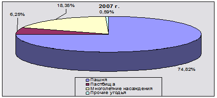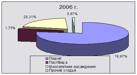 Так в 2006 году имеет место следующее распределение сельхозугодий (см. рис.2.4.) 76,97% отведено под пашню, 20,31% под многолетние насаждения, 1,75% под пастбища, прочие угодья составляют 0,97%. Аналогично рассмотрим распределение сельхозугодий в 2007 году (рис.2.5).