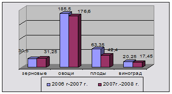 Согласно проведенным расчетам СПК Агрофирма «Родина» Имеет высокие показатели урожайности по овощам, плодам и виноградникам, уровень урожайности зерновых значительно ниже. На рис.3.2. отразим уровень урожайности основных культур хозяйства.