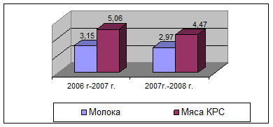 За исследуемые периоды 2006-2008 года производство молока и мяса СПК Агрофирма «Родина» на 100 га с/х угодий в центнерах уменьшено, в период 2007-2008 года предприятие снизило производство и молока и мяса, что вызвано факторами увеличения площади сельхозугодий.