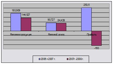 Валовая продукции предприятия было произведено в среднем меньше на 49,382 тыс.грн. в 2007-2008 годах, по валовому доходу абсолютное снижение в тот же период составило 6,288 тыс.грн. на 100 га. Прибыль при использовании земельных ресурсов предприятие получило в 2006-2007 годах, она составила в среднем за этот период 253,5 тыс.грн., а в 2007-2008 годах зафиксирован убыток в среднем на уровне -160 тыс.грн.